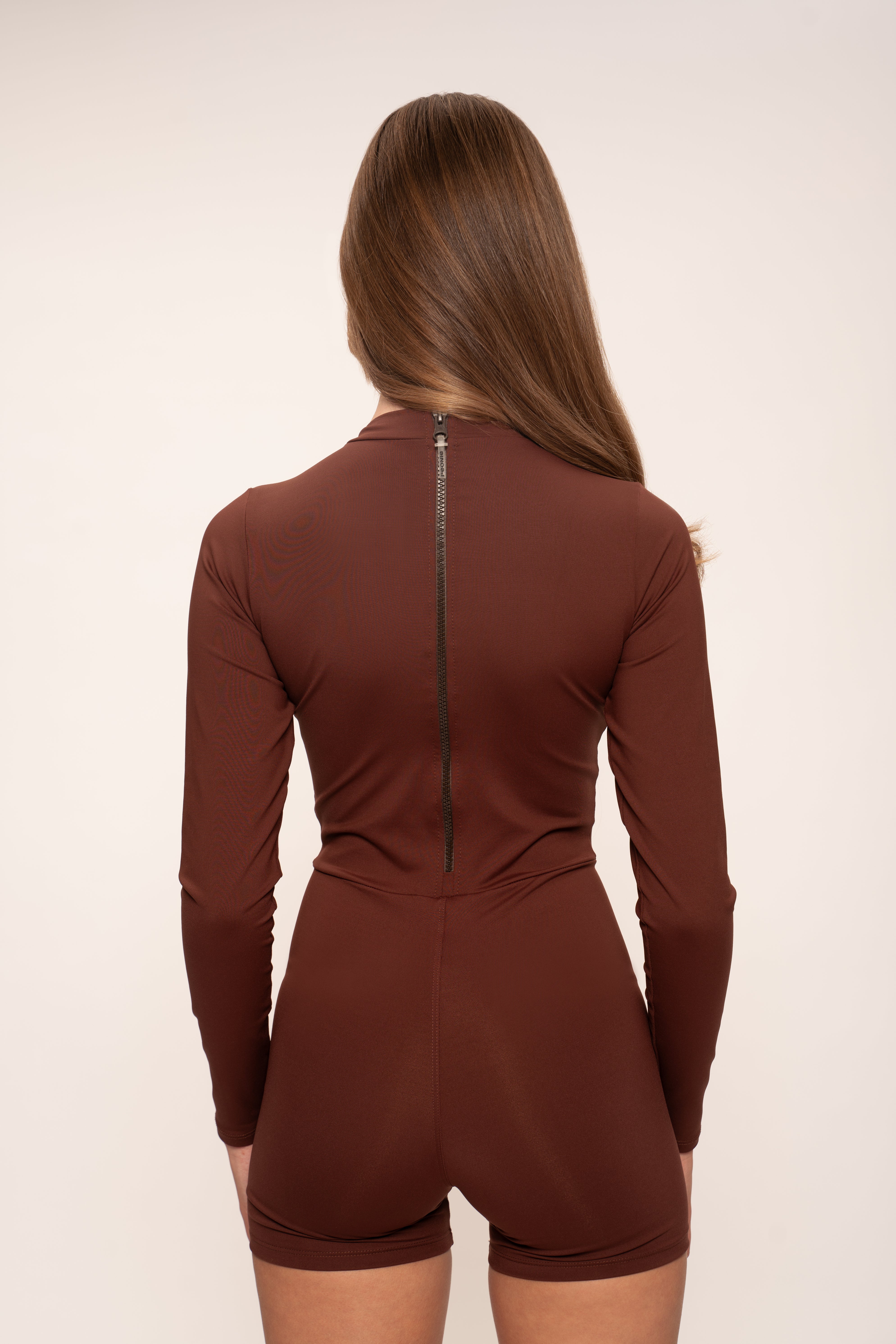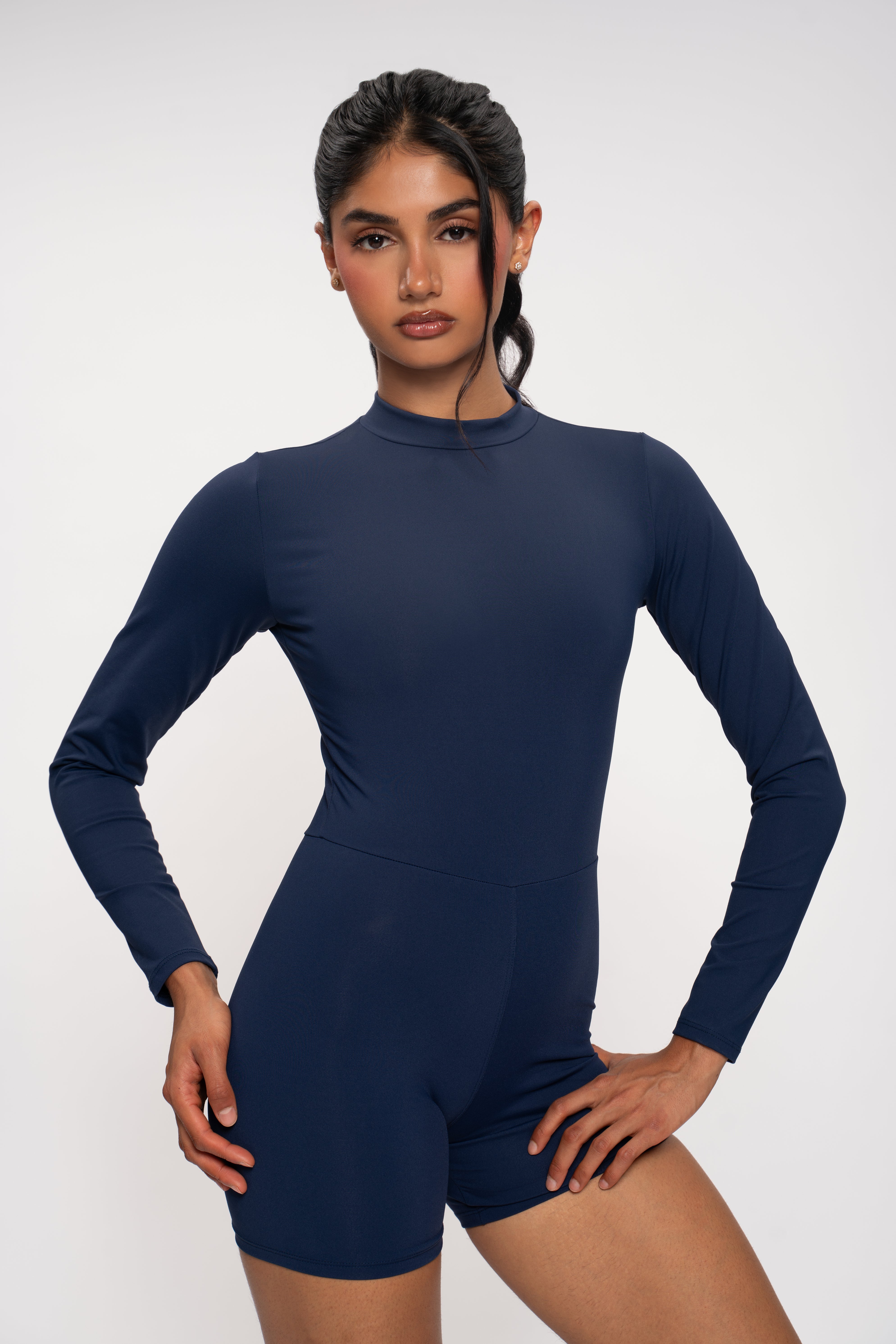 Ajuste de compressão projetado para modelar e dar suporte ao corpo. Silhueta curta com mangas compridas para cobertura e controle equilibrados.