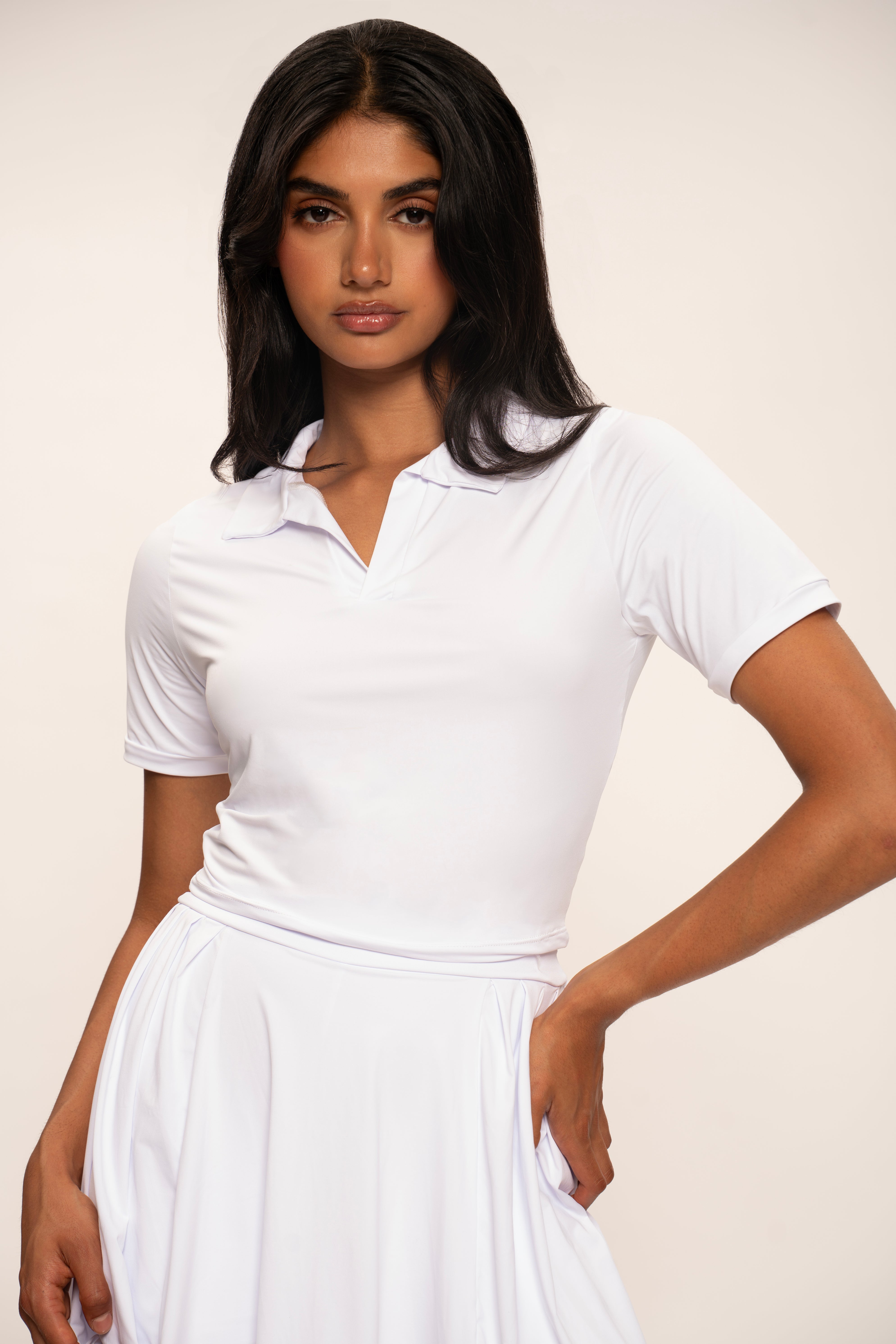 The Motion Polo Top was created to combine athletic functionality with a refined, feminine silhouette. Featuring a classic collar with a V-neck opening, it delivers a clean, sport-inspired look while maintaining a sleek, body-hugging fit. The hip-length cut enhances proportions and makes it an easy, versatile piece for active days and elevated sporty styling.